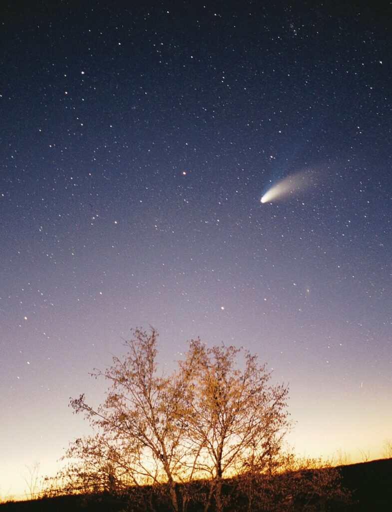 Les comètes sont essentiellement des boules de neige fait de poussières et de glaces. Elles orbitent autour du système solaire. Mais à mesure qu’elles se rapprochent du soleil elles se désintègrent parce que des particules provenant du soleil frappent des morceaux de glace et de poussière, c’est pourquoi on voit la queue des comètes éclairée par la lumière du soleil.