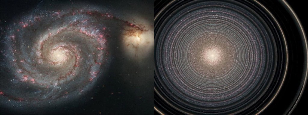 Ce n’est pas spéculatif, nous mesurons la vitesse de rotation des étoiles grâce au décalage Doppler, donc on peut calculer le rythme à lequel les bras s’emmêleraient. Après 100 millions d’années environ, le motif spiral serait méconnaissable. Or, les galaxies spirales observées ont, selon les cosmologistes, 10 milliards d’années. Elles auraient dû perdre leurs bras depuis longtemps. Pourtant, elles sont là. Aujourd’hui on observe aucune galaxie qui ressemble à l’image de droite. Certaines personnes disent que l’univers semble vieux, mais ce n’est pas le cas, les galaxies spirales semblent jeunes.