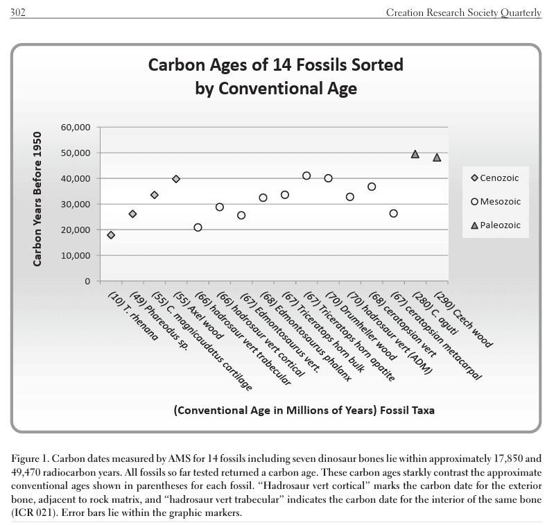Thomas, B. and V. Nelson. 2015. Radiocarbon in Dinosaur and Other Fossils. Creation Research Society Quarterly. 51(4): 299-311.