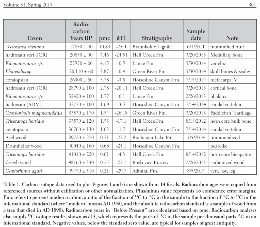 Le tableau ci-dessus de Thomas et Nelson montre un échantillon de fossiles anciens (plusieurs dizaines et centaines de millions d’années selon les évolutionnistes) avec des quantités de carbone substantielles retrouvées. Les « Radiocarbon Years BP » (before present) ne sont pas calibrées mais pourraient très bien redescendre dans l’échelle biblique en tenant compte des ratios de carbone anciens.