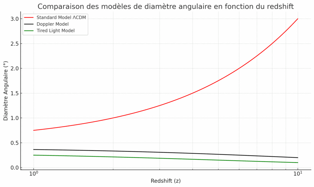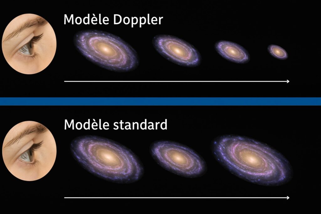 Si les galaxies lointaines sont plus grandes que prévu, cela confirme le modèle FLRW. Si elles restent plus petites, cela pourrait invalider le modèle FLRW et soutenir l’idée d’un modèle Doppler. Le schéma ci-dessous illustre bien les deux attentes observationnelles: