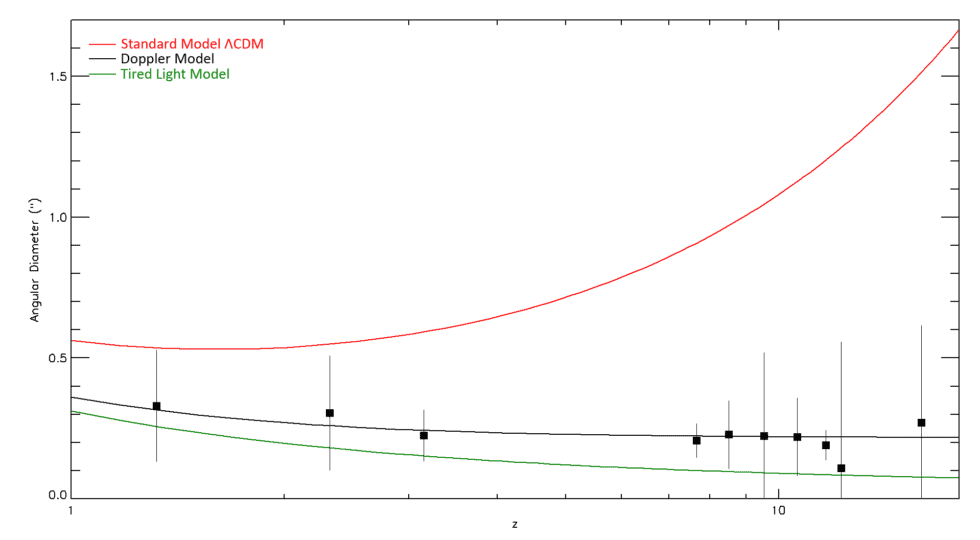 - Courbe noire: prédictions du modèle Doppler (pas d’expansion : la taille diminue toujours avec la distance).