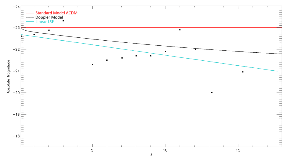 Les points noirs suivent parfaitement la courbe du modèle Doppler. Ils sont incompatibles avec la courbe du modèle FLRW: aucune mesure ne serait même dans une marge d’erreur d’un écart-type avec le modèle standard.